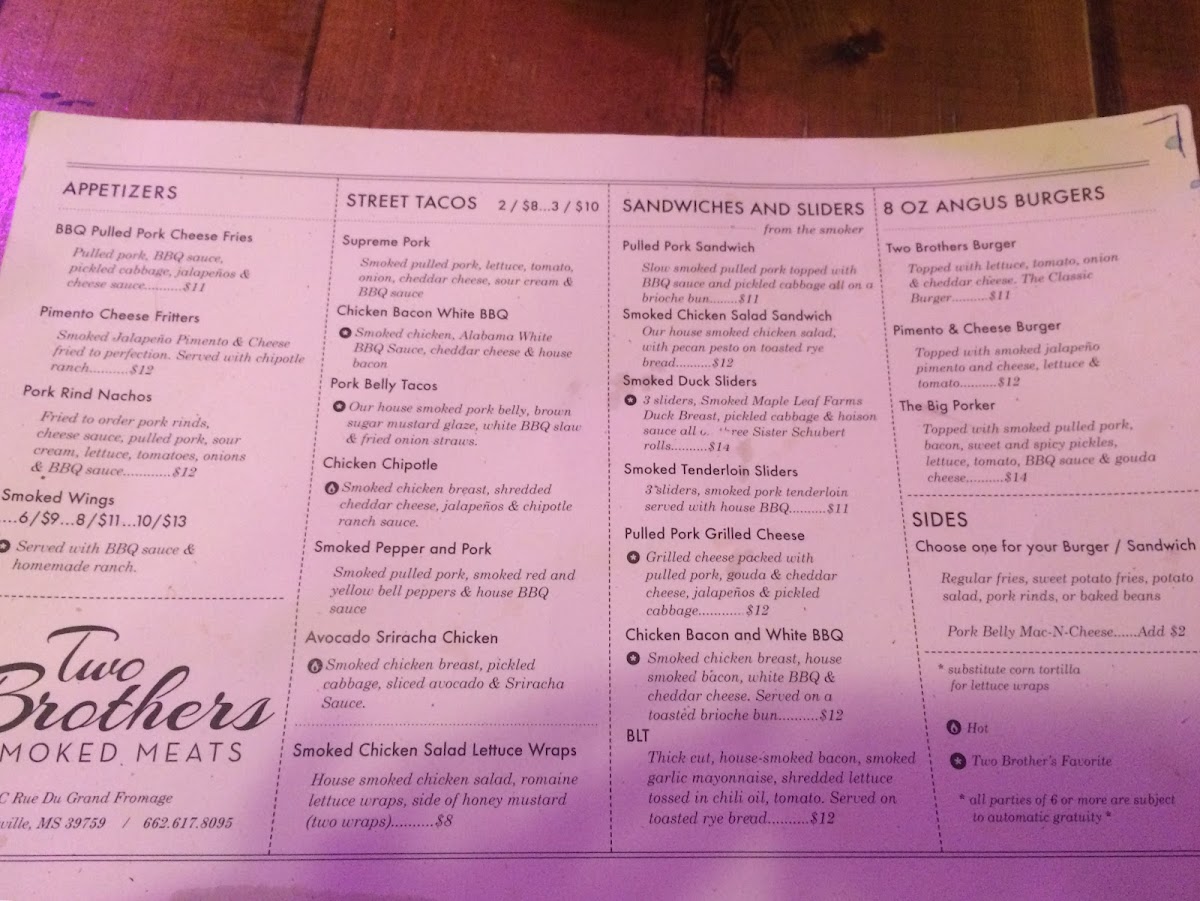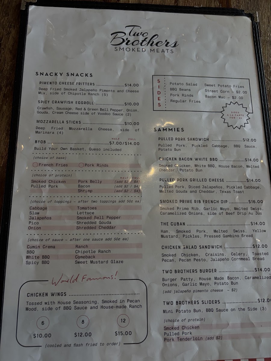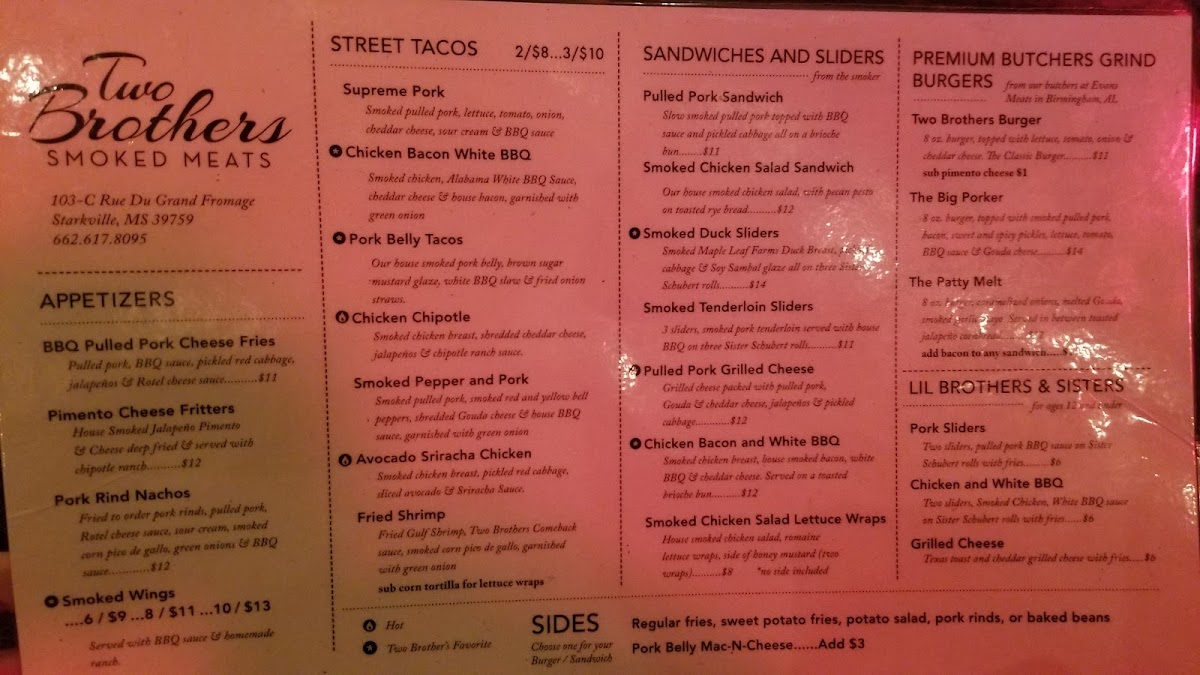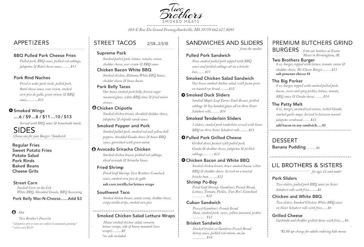 If you’re checking out the Two Brothers Smoked Meats Menu, come hungry and maybe even a little impatient-in the best way possible. The smell of slow-smoked brisket and pulled pork tends to hit before you even decide what to order. Sitting right on University Drive in Starkville, this spot keeps things simple, hearty, and seriously satisfying.